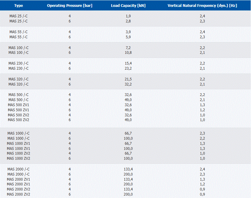 The membrane air spring works by the principle of an enclosed air volume in a reservoir, sealed with a rubber membrane. On top of the membrane, the air spring load plate carries the object that has to be isolated. With rising pressure inside the air reservoir, the force on the membrane increases as well. If this force is greater than the force caused by the weight of the object, the membrane arches upwards and lifts the object. The advantages of membrane air springs are the high horizontal spring stiffness and variable air damping that is adjustable by a throttle valve. The membrane air springs type -C include the level control valve. Air Springs of Type -CPC comprise of the level control valve and an electronic position indicator.
