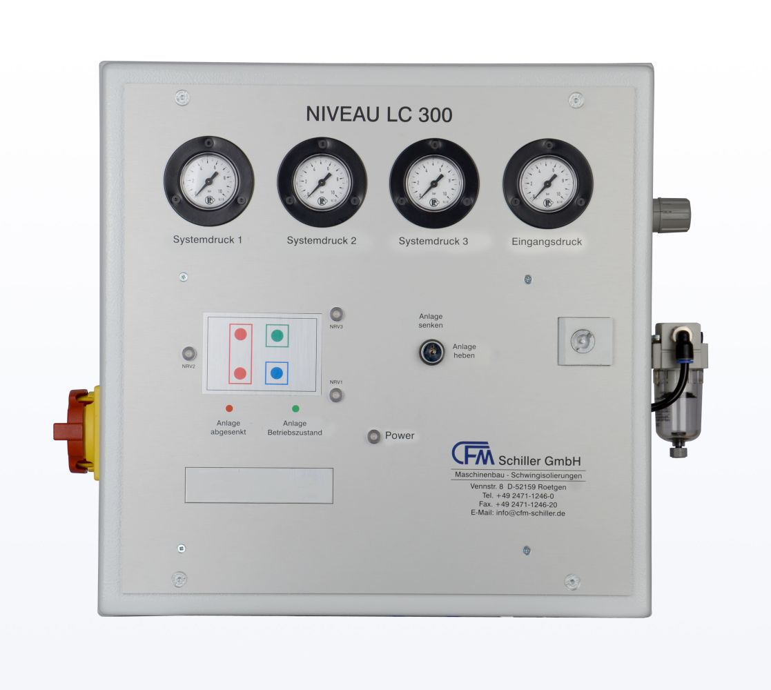 The level control unit comprises the supply unit to adjust the input pressure, to drain the water from the compressed air and separate the vibration isolation system from the supply pressure by a ball valve. The main air flow can be adjusted by a throttle valve. The actual input pressure and the pressure in the three sub systems is displayed by analog pressure gauges.